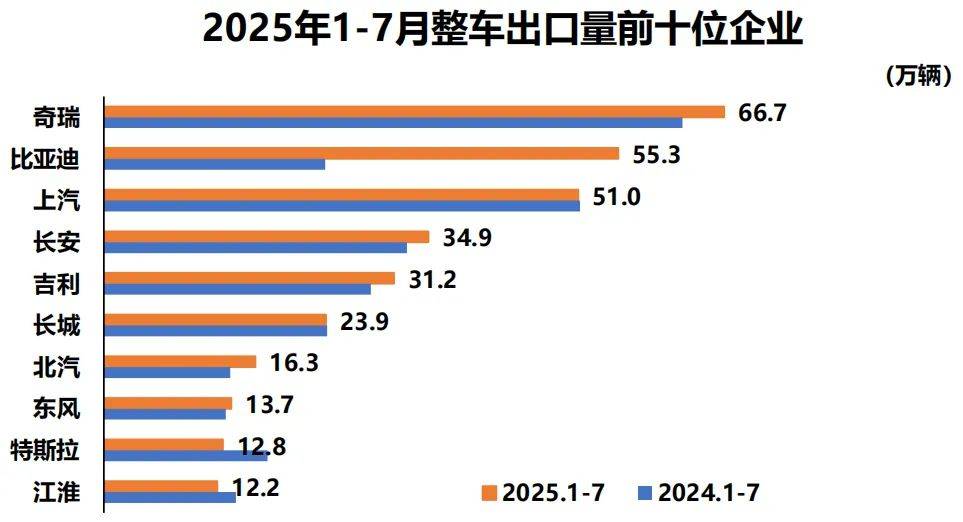 1至7月,整車出口前十企業中,奇瑞出口量達66.7萬輛,同比增長7.3%,占總出口量的18.1%。與上年同期相比,比亞迪出口增速最為顯著,出口達55.3萬輛,同比增長1.3倍。